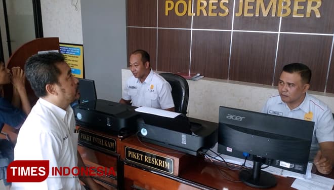 TIMES Semarang/Wakil Ketua Bidang Litbang dan IT DPD Partai Perindo Kebupaten Jember, Ahmad One Prastiono saat melaporkan Ketua DPD Partai Perindo Kabupaten Jember Hanung Prijobodo ke Polres Jember, Senin (6/5/2019). (FOTO: Dody Bayu/TIMES Indonesia)